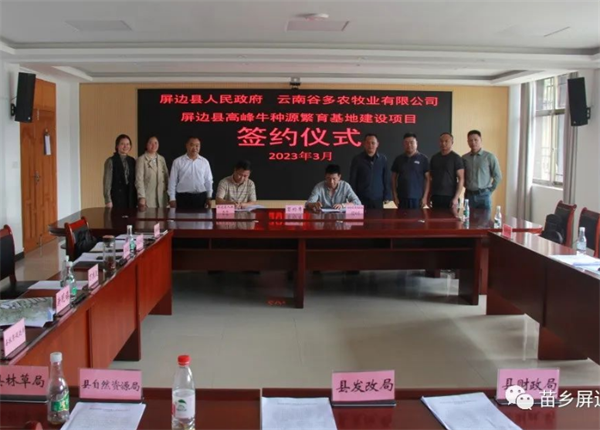 3月21日,屏边县人民政府与云南谷多农牧业有限公司签订屏边县高峰牛种源繁育基地建设项目合作协议。