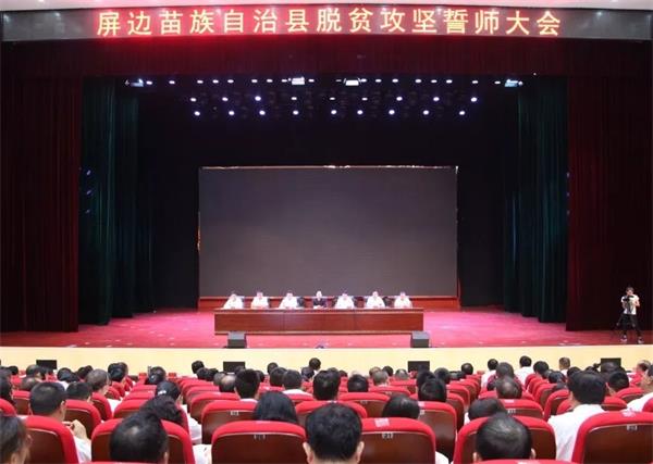 5月28日,屏边县举行脱贫攻坚誓师大会。县处级领导,县委和县级国家机关各部委办局、各人民团体干部职工和省州驻屏单位班子成员,各乡镇党政班子成员,全县各驻村工作队队员在县级主会场参加会议;各乡镇机关全体干部职工及村委会“四职”干部在乡镇分会场参加会议。会议以视频的形式开到各乡镇,主会场和分会场共2000余人参加誓师大会。