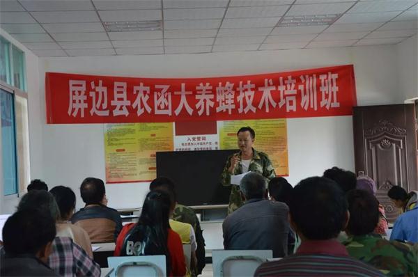 9月6日,屏边县科协将科普大篷车开到和平镇白沙村委会,举办农函大养蜂技术培训班,为该村56名贫困群众、村干部送去养蜂技术。