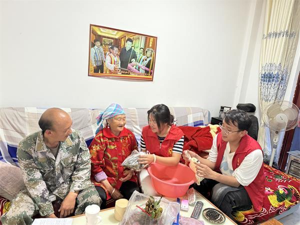 活动当天,志愿者们齐动手,同参与,一边唠着家常,一边拿起粽叶,将粽叶卷成斗状,填米、放腊肉、压紧、扎绳,很快三角形、牛角形......各式各样的漂亮粽子就诞生了。粽子包好之后,志愿者们又将一颗颗飘香的粽子分装成袋,马不停蹄前往孤寡老人和困难老人家中,挨家挨户走访慰问,为老人们送去粽子和生活物资。每到一户,慰问人员都与他们贴心交流,详细了解他们的家庭状况、健康状况,并记录下3户老人提出的就医陪同、家电维修等具体诉求,后续将安排专人跟进解决,同时叮嘱老人:“有困难随时联系我们,政府一直都在!”