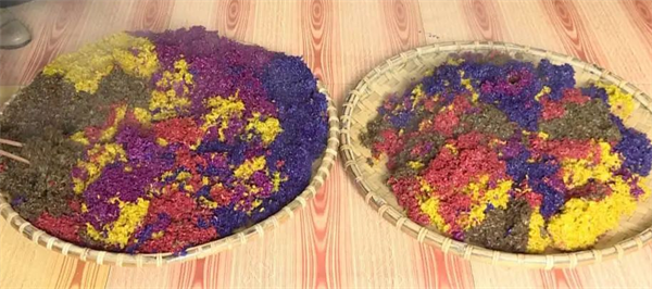 花米饭是勤劳聪明的壮家妇女采摘最新鲜、纯天然的野生植物作为染料,通过舂、煮、泡等工序,将糯米染成红、黄、蓝、紫等多种颜色,然后放到甑子里蒸熟,香醇无比、糯软健康。