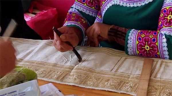 在老师的精心指导下,苗族妇女们屏气凝神地用腊刀在染布上画着图案,漂亮的蜡染图案慢慢呈现出来,有的绣娘以前从来没有接触过苗绣蜡染,通过此次培训,系统地学习了蜡染技术。