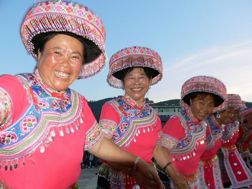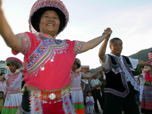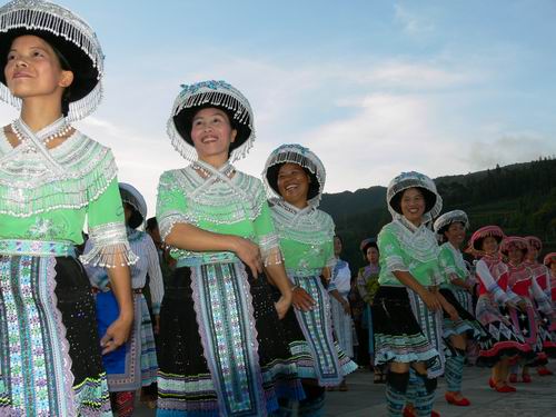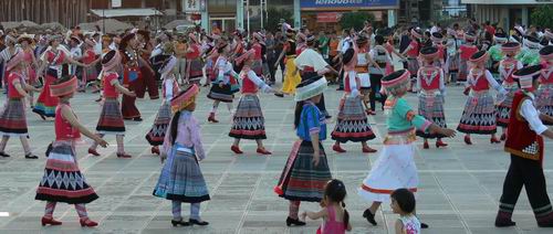 随着优美的旋律和苗族歌声响起来,数百名身穿绚丽苗族服饰的男女老少手拉手,不约而同地跳起了极具苗族特色的大型舞蹈《同乐颂》,人们在欢快的节奏和强烈的动感中,尽情享受着源远流长的苗族文化带来的无限欢乐。