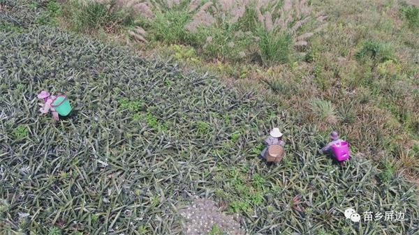 村民苏某某家的菠萝地里,一支由10人组成的采摘队正在忙着采摘、驮运,他们分工合作、动作麻利,一个个优质菠萝在车上摆放整齐。全村在菠萝地里采摘的有100人左右,菠萝的采收季从3月持续到4月,这期间需要大量工人,每人每天有200元左右的收入。