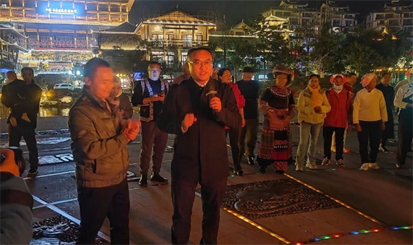 熊朝忠一行先后到滴水苗城、花山广场、大围山民族体育馆、苗历广场等地,通过实地查看、听取介绍、沟通交流等方式,详细了解屏边县康养融合发展现状和基础设施建设等情况,并与屏边各族群众一起,围绕在熊熊篝火边欢快地舞蹈,还现场展示了精湛的拳击技术。