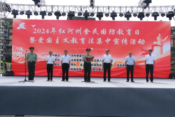 9月19日,红河州2024年全民国防教育日暨爱国主义教育法集中宣传活动在屏边县举行。州委常委、蒙自军分区政委黄勤生讲话并宣布活动启动。
