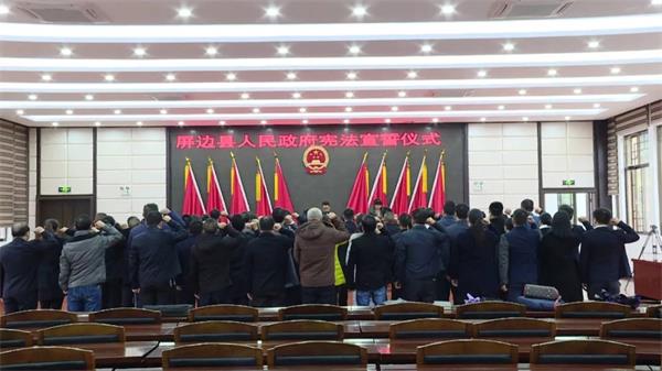 12月4日是第六个国家宪法日,屏边县人民政府举行宪法宣誓仪式。仪式上,2019年度县政府任命的国家工作人员依法进行宪法宣誓。县长李雄文现场监誓。