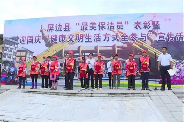 9月17日,屏边县举行“最美保洁员”表彰暨迎国庆“健康文明生活方式全参与”宣传活动,弘扬环卫工人“宁愿一人脏、换来万家洁”的无私奉献精神,动员广大市民和社会各界支持环卫工作,尊重环卫工人劳动成果,自觉养成维护环境卫生的良好习惯,共同建设和维护美好家园,同时为推进爱国卫生“7个专项行动”和健康屏边建设,广泛动员社会力量参与爱国卫生运动和健康促进工作,全面提高广大人民群众健康素养水平。