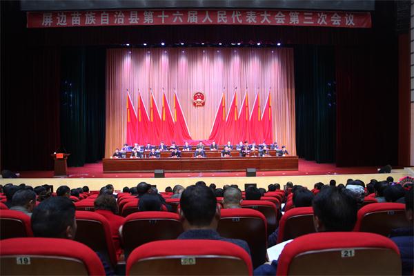 1月8日下午,屏边苗族自治县第十六届人民代表大会第三次会议在县城第一中学礼堂隆重开幕。本次会议应到代表154名,实到代表137名,符合法定人数。
