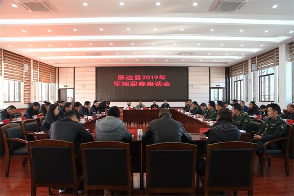 1月24日,屏边县召开2019年军地迎春座谈会,军地双方畅叙鱼水深情、共谋融合发展。苏畅、李雄文、杨文学、李永增、许春平、李政权等县领导,各驻屏部队首长,县双拥工作领导小组成员单位负责人参加会议。