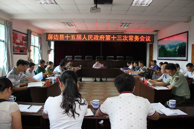 会议听取了屏边县2015年第二季度安全生产工作情况通报,讨论审议了《屏边县供销合作社综合改革实施方案》、《关于零开电站收购有关事宜》、《关于研究政府性基金调整用于营盘水库工程县级配套建议的有关事宜》、《关于审定屏边县主题型商业购物中心项目投资开发建设协议的有关事宜》、《关于研究屏挂2015-1、-2、-3号三宗国有土地使用权挂牌出让方案的有关事宜》等七项议题。