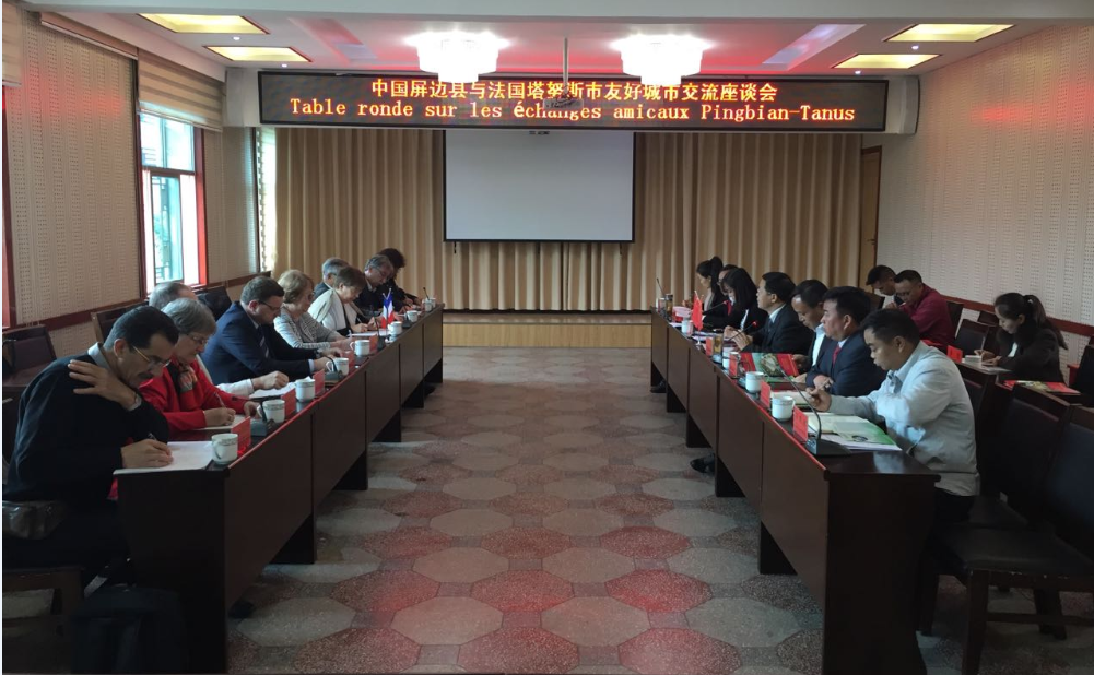 座谈会上,县委书记苏畅向代表团代表介绍了屏边的自然条件、民族文化、旅游开发等情况,同时还就2016年10月双方在法国塔努斯市会谈时达成的交流机构组建、旅游、教育、民族文化交流等合作意向作了说明。苏畅指出,中国国家主席习近平在中法建交50周年纪念大会上指出,“中国梦是法国的机遇,法国梦也是中国的机遇。”屏边县和塔努斯市虽然相距遥远,但一百多年来的滇越铁路、人字桥一直相互影响着两国两地的经济、文化、社会等方面,屏边县各族人民愿意同塔努斯市人民在平等互利、合作共赢的基础上,不断加强双边在经贸、历史、文化特别是旅游领域的合作,让更多的法国朋友和法国友人了解屏边、认识屏边、走进屏边,进一步增进两国两县市之间的友谊。