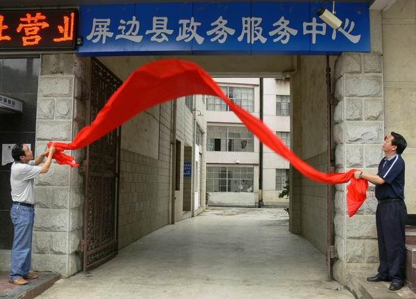 县委副书记、县人民政府县长杨国椿,县委副书记、新农村建设工作队总队长王笑波共同为屏边县政务服务中心揭牌。杨国椿希望进驻部门和中心工作人员要强化服务意识、效率意识和创优意识,真正把县行政服务中心办成政府的“民心工程”和“阳光工程”,努力树立起新形势下政府机关文明服务、优质服务、高效服务的新形象,真正把行政服务中心办成领导满意、群众认可、服务一流的政府服务窗口。[毛菊/文 信息/摄]