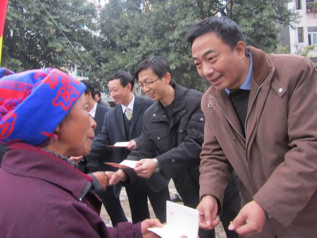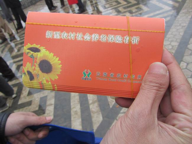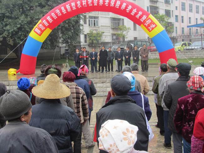 1月9日上午,屏边县新型农村社会养老保险金发放仪式在县政府中心花园广场举行,玉屏镇100名年满60周岁的农村老人领到了写有他们名字的新型农村养老保险存折,