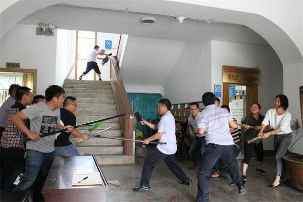 本次演练设现场指挥部、综合协调组、防御对抗组、暴徒扮演组、安全保卫组、宣传组、医疗救治组、通讯保障组、人员疏散组,共9个组。为确保演练的真实性和完整性,工作人员按照实际设计了场景和演练情节,精心准备了受伤时的“血浆”,在“暴徒”袭击时,真实拨打了110报警电话和120急救电话。在演练过程中各组默契配合,衔接有序,各参演人员认真投入到演练中,把模拟当实际,利用身边的各种工具与“暴徒”进行对抗,等待警察的到来并最终制服“暴徒”,最大限度地减少了伤亡,整个反恐防暴应急演练取得了圆满成功。
