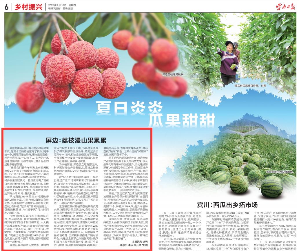 7月10日,云南日报“乡村振兴”版以“屏边:荔枝漫山果累累“为题,书写屏边县荔枝产业的“甜蜜答卷”。