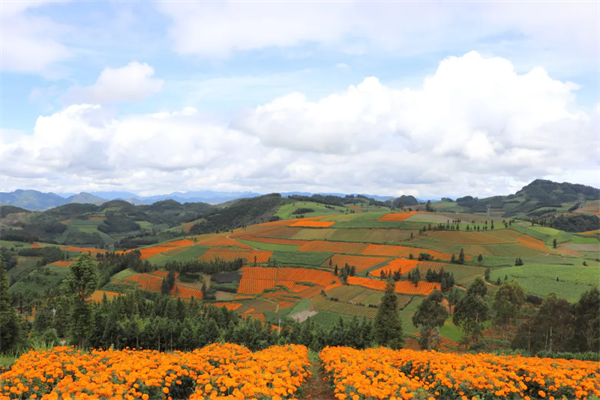 新华乡位于屏边县东北部,最高海拔2291.6米,最低海拔718米,年平均气温16.1℃,非常适宜万寿菊的生长。万寿菊是一种一年生草本植物,是提取纯天然叶黄素的最佳原料,成活率高、花期长,而且病虫害少、田间管理简单、劳动强度小,其花和叶入药有清热、化痰、补血通经的功效,有很高的经济价值。