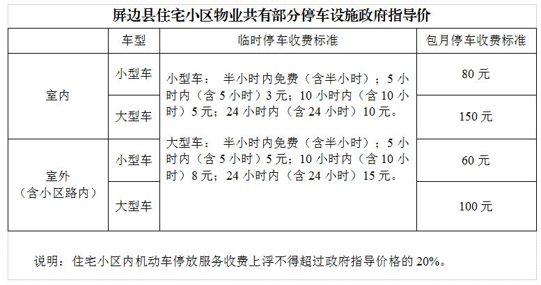 参照屏边县住宅小区物业共有部分停车设施政府指导价执行,但不得上浮收费标准。