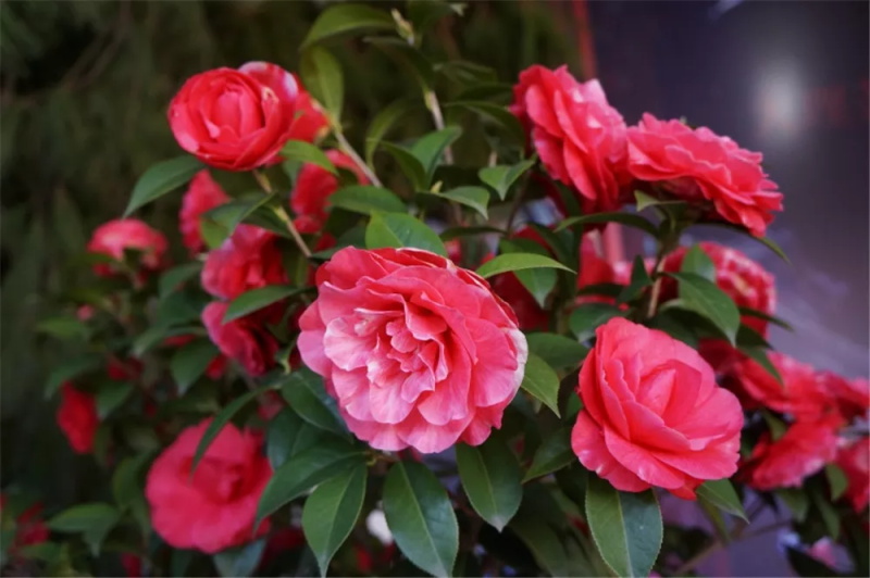 茶花属山茶科,花瓣为碗形,分单瓣或重瓣,有不同程度的红、紫、白、黄各色花种,甚至还有彩色斑纹茶花,花期较长,从10月份到翌年5月份都有开放,盛花期通常在1-3月份。茶花惧风喜阳,适宜种植于地势高爽、空气流通、温暖湿润、排水良好、疏松肥沃的砂质壤土,黄土或腐殖土中,春秋冬三季可不遮阴,夏天可用50%遮光处理。
