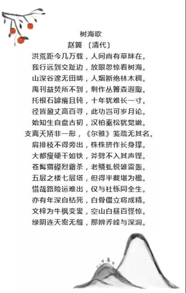 最早赋予大围山文化内涵可以追溯到(清)乾隆年间。江苏进士赵翼在机缘巧合下踏入大围山,被大围山中的林海及数千年的古树蔓藤所折服,写下了《树海歌》这一不朽诗歌。诗歌中“洪荒距今几万载,人间尚有草昧在。我行远到交趾边,放眼忽惊看树海。”等诗句将大围山中犹如桃花源般的“树海”跃然呈现于大众眼前。大围山也因赵翼的《树海歌》广为人知,自此,不少文人墨客开始重视大围山的文学艺术价值。而赵翼也因此被称为中国文人书写宣传大围山的开山鼻祖。