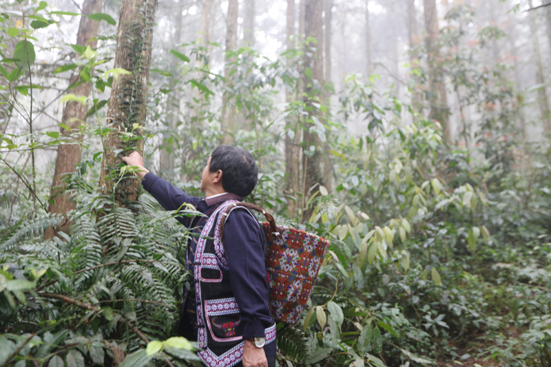 上山采药,并不是我们想象中地找寻。祖辈们千百年里的翻山越岭,在这片大山里“绘制”了一幅精确的草药地图,心口相传,后来者可以按图索骥。我们很快到达大山深处,穿行于大雾弥漫的丛林中,水珠打湿衣衫,杨国华专心致志地寻觅着可以入药的草药。