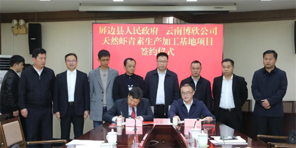 经前期项目试验和洽谈,1月9日至10日,云南博欣生物科技股份有限公司董事长、云南博浩生物科技股份有限公司总经理柏老六一行赴屏就天然虾青素生产加工基地项目进行实地选址,并举行项目签约仪式,商谈项目建设推进相关事宜。县领导宋文辉、王周林、刘红明、万执政、付田跃、吴红昌及县有关部门和乡镇负责人参加会议。