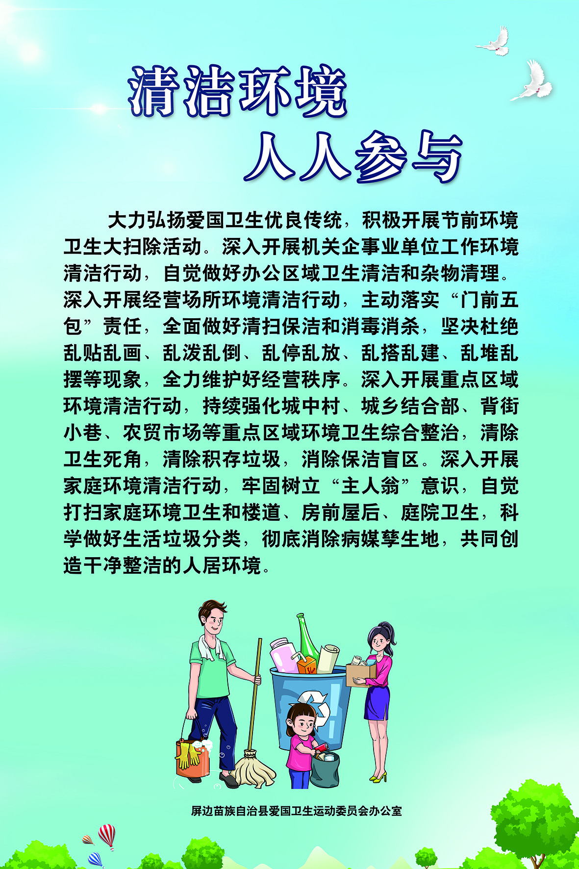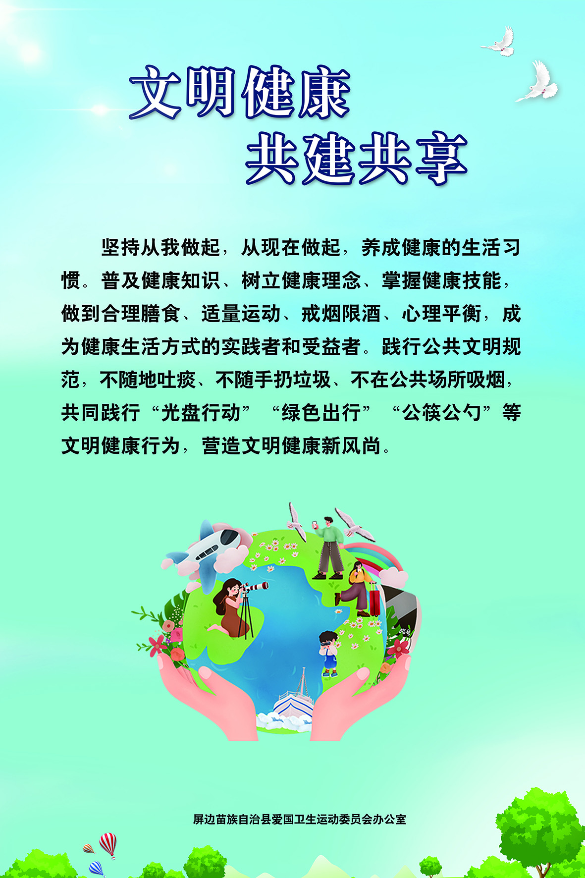 扫尘除垢辞旧岁,健康文明迎新年。让我们积极行动起来,从身边做起,从小事做起,持续弘扬爱国卫生传统、提升文明健康素养,争做健康理念的倡导者、时代新风的传播者、美好环境的捍卫者,共建健康屏边,共享健康生活,共度新春佳节。
