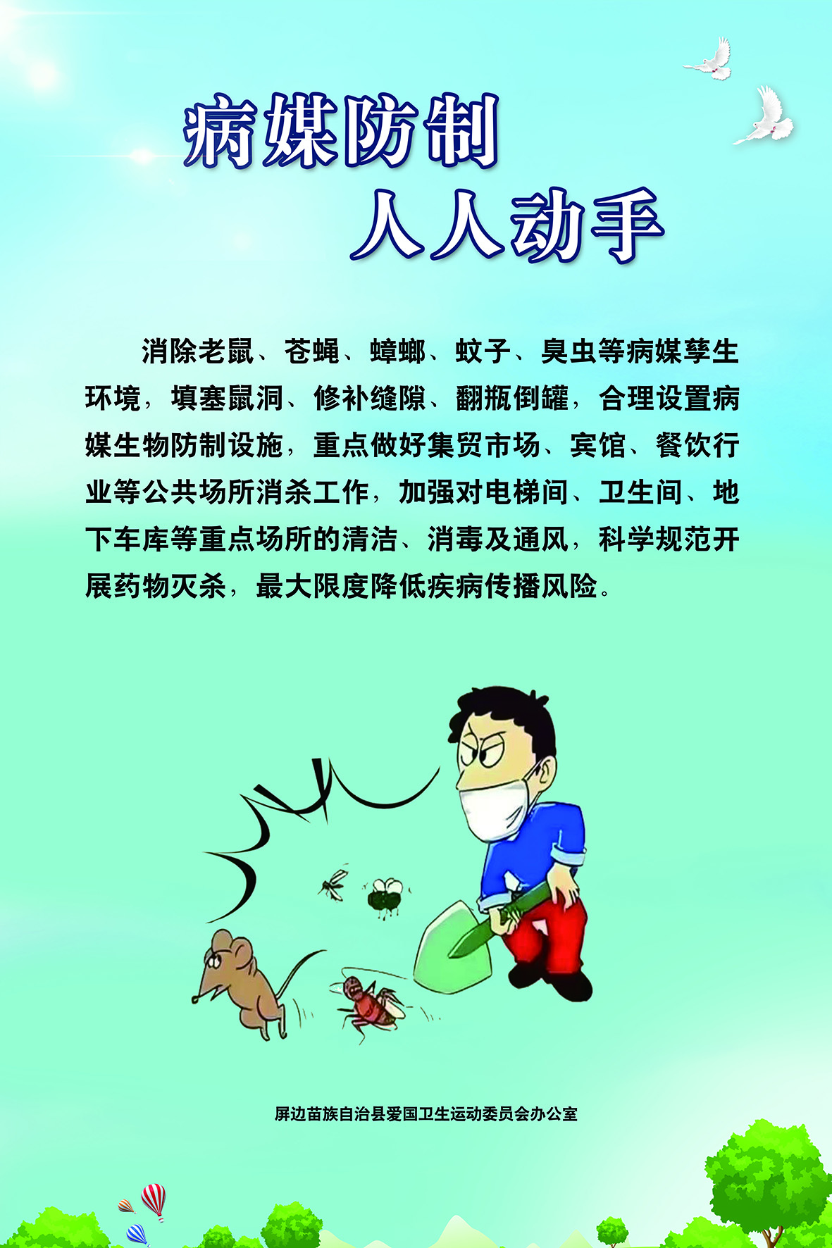 消除老鼠、苍蝇、蟑螂、蚊子、臭虫等病媒孳生环境,填塞鼠洞、修补缝隙、翻瓶倒罐,合理设置病媒生物防制设施,重点做好集贸市场、宾馆、餐饮行业等公共场所消杀工作,加强对电梯间、卫生间、地下车库等重点场所的清洁、消毒及通风,科学规范开展药物灭杀,最大限度降低疾病传播风险。