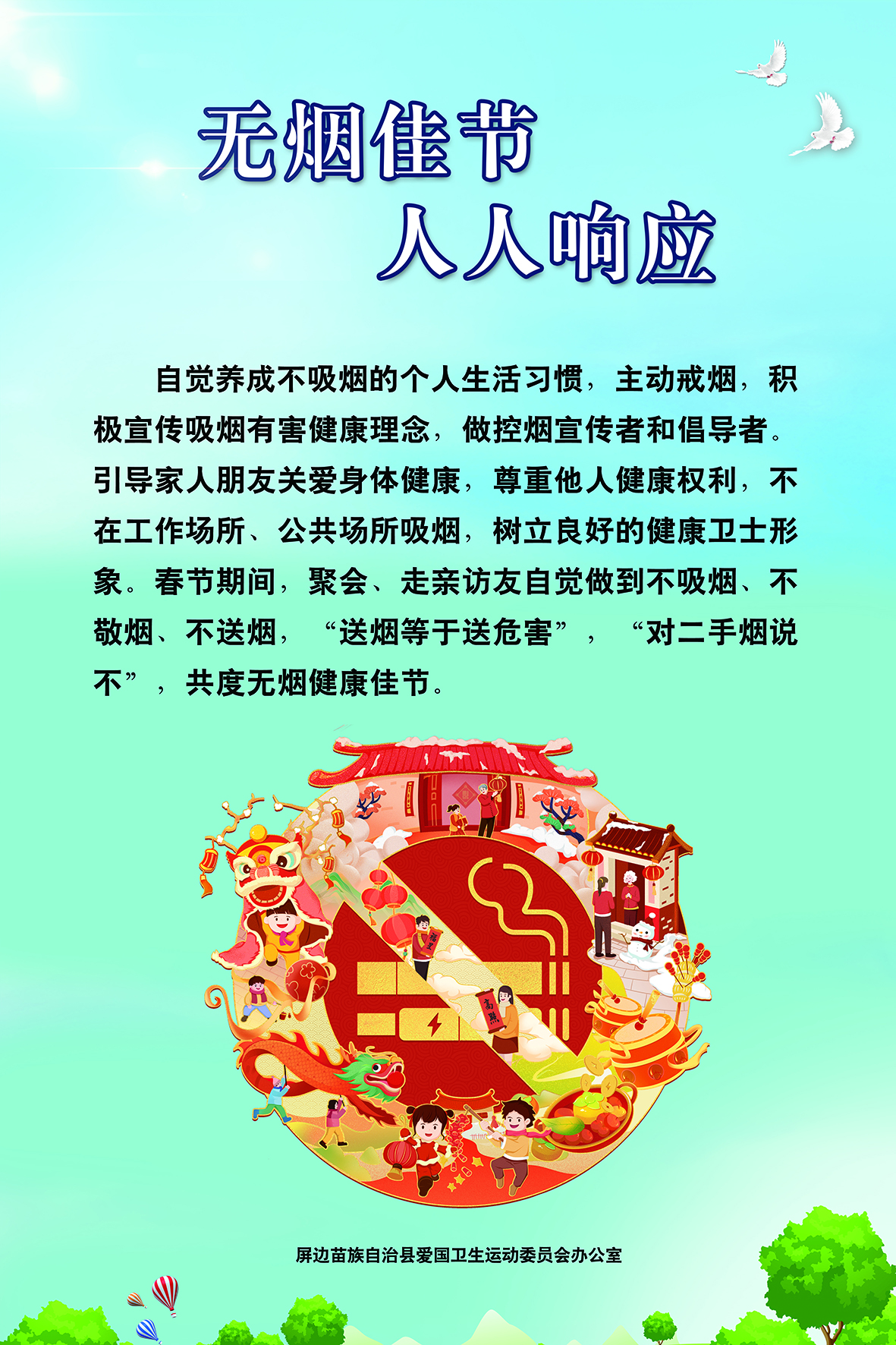 自觉养成不吸烟的个人生活习惯,主动戒烟,积极宣传吸烟有害健康理念,做控烟宣传者和倡导者。引导家人朋友关爱身体健康,尊重他人健康权利,不在工作场所、公共场所吸烟,树立良好的健康卫士形象。春节期间,聚会、走亲访友自觉做到不吸烟、不敬烟、不送烟,“送烟等于送危害”,“对二手烟说不”,共度无烟健康佳节。